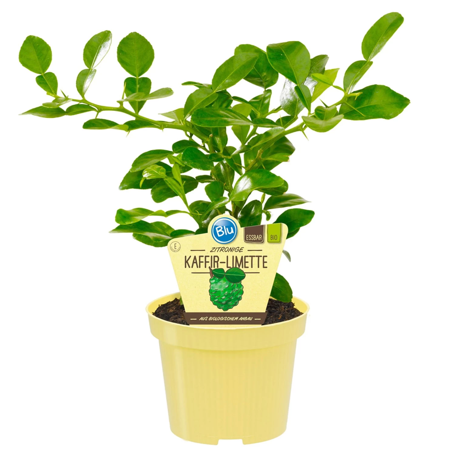 Die dunkelgrünen stark geflügelten und duftenden Blätter der Gewürz-Limette (Citrus hysrtix), auch als Kaffirlimette bekannt, begeistern das ganze Jahr über mit satt grüner Farbe und dornenbewehrten Zweigen. Das Kaffirlimettenbäumchen bildet durch straff abstehende Verzweigung ein etagenförmiges Erscheinungsbild. Die mediterrane Kübelpflanze kann eine Wuchshöhe von 0,50-2 Metern erreichen.