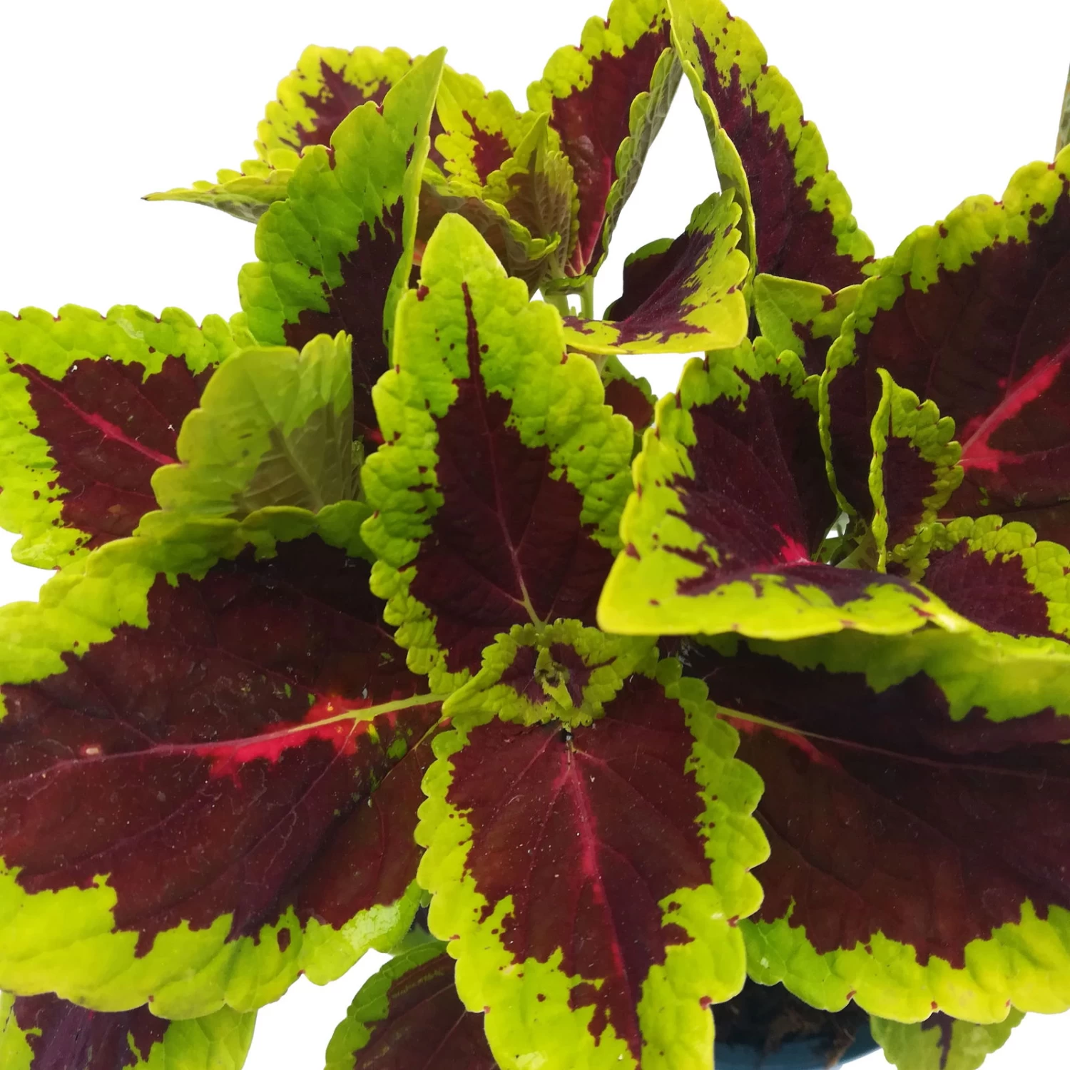 Die keilförmigen, gekerbten Blätter der Buntnessel (Solenostemon scutellarioides ‚Alligator Alley‘), früher auch Coleus blumei genannt, begeistern mit ihrer dunkelroten Mitte, die mit pinken Adern gezeichnet und durch einen hellgrünen Rand eingefasst ist. Zur Nomenklatur kann auch der Gattungsname Plectranthus verwendet werden. Die Buntnessel kann eine Wuchshöhezwischen 20 und 60 cm erreichen.