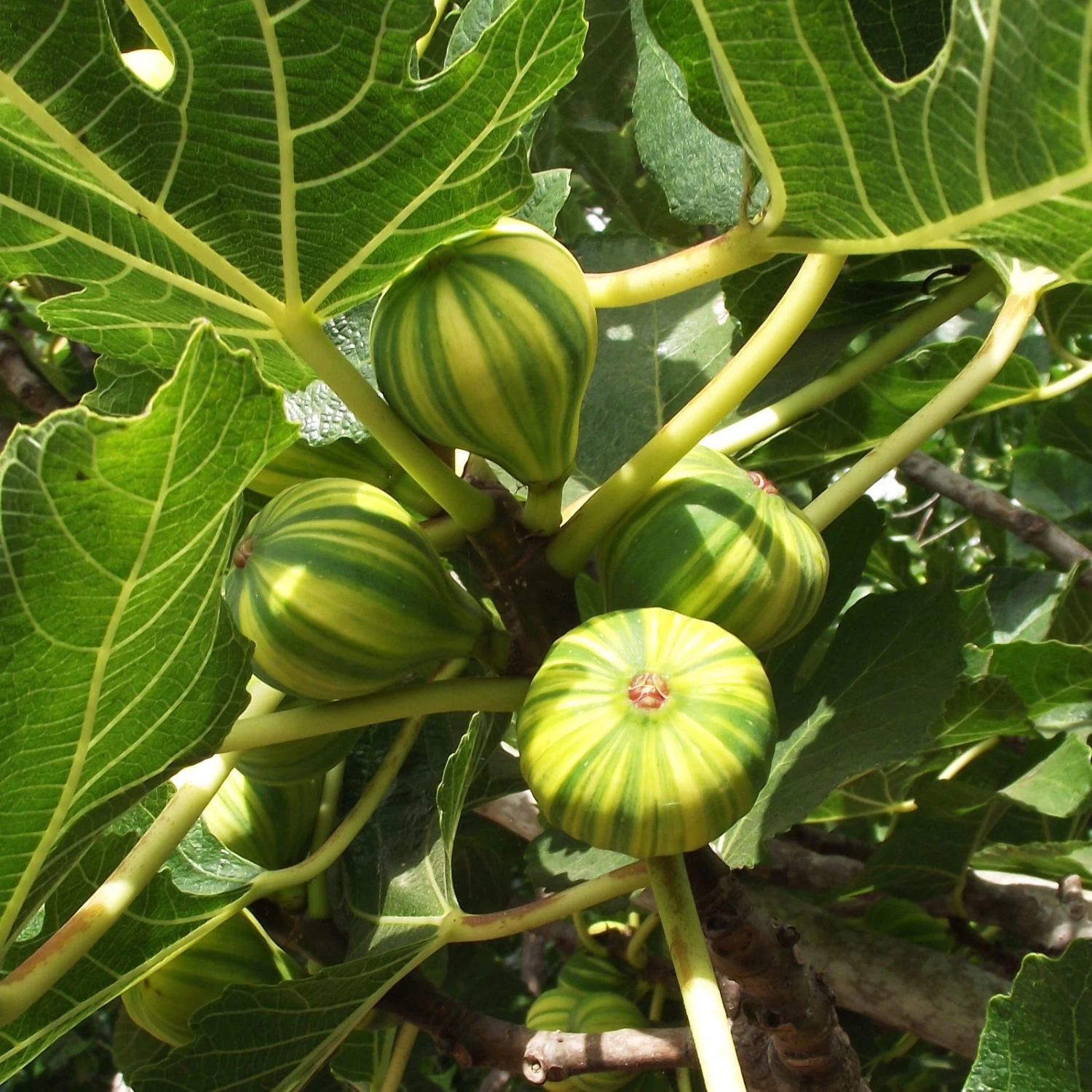 Die Feige Ficus carica ‚Panaché‘, auch Melonen-Feige genannt, überrascht mit ihren gestreiften Früchten. Diese Feige wächst ausladend und nahezu quadratisch mit einer Höhe und Breite von rund 300 Zentimetern. Fühlt sich die Feige wohl, trägt sie reichlich Obst, sodass Sie während der Saison genug aromatische Früchte zum Naschen, Einkochen und Dörren haben. Die Melonen-Feige macht in jedem Gartenkontext eine gute Figur und lässt draußen eine mediterrane Atmosphäre entstehen. In Regionen mit mildem Weinbauklima benötigt die Feige ‚Panaché‘ selten Winterschutz. Wenn im Winter über mehrere Tage Temperaturen unter -15 Grad Celsius zu erwarten sind, sollten Sie die Feige mit Vlies abdecken. Als Standort eignet sich ein sonniger, windgeschützter Platz ohne Staunässe am besten.