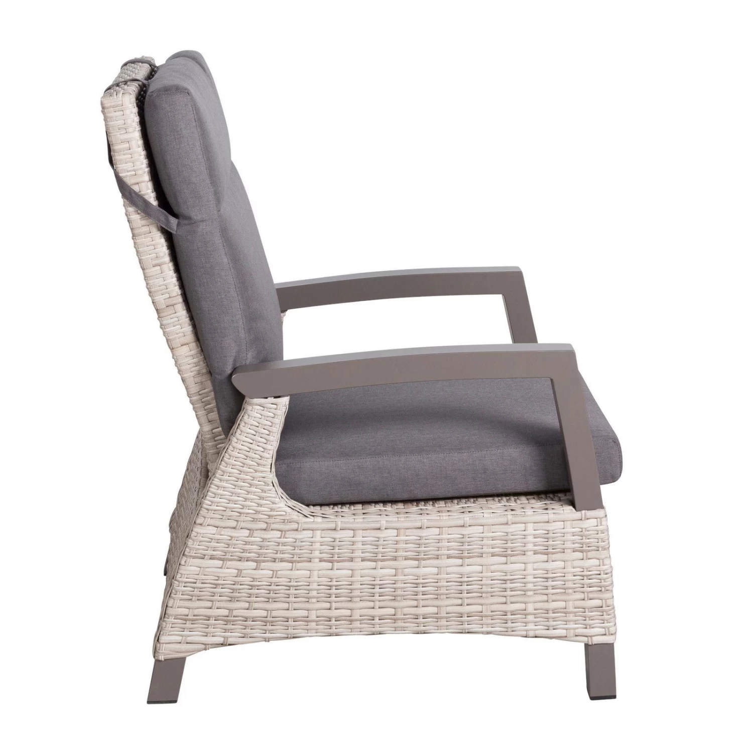 Für mehr Bequemlichkeit sorgt die dazu harmonisch passende Auflage aus Polyester und die stufenlos verstellbare Rückenlehne. Der moderne Sessel ist für den dauerhaften Einsatz im Außenbereich konzipiert und somit wetterfest und pflegeleicht.