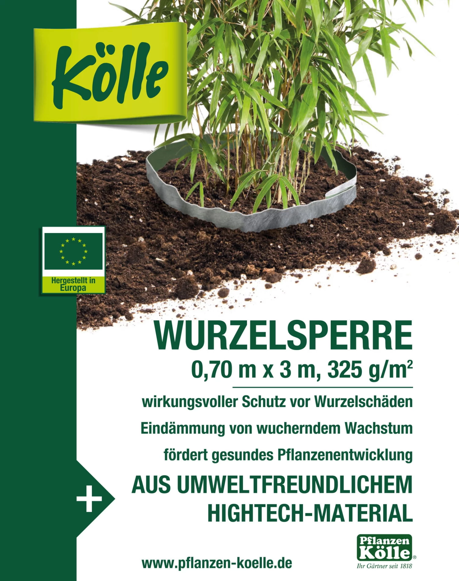 Die professionelle Kölle Wurzelsperre für Bambus besteht aus umweltfreundlichem Spezialvlies. Das Vlies ist chemisch neutral und völlig unbedenklich. Kölle Wurzelsperre für Bambus dämmt das wuchernde Wachstum von Bambus ein und schont dabei umgebende Pflanzen und Material.