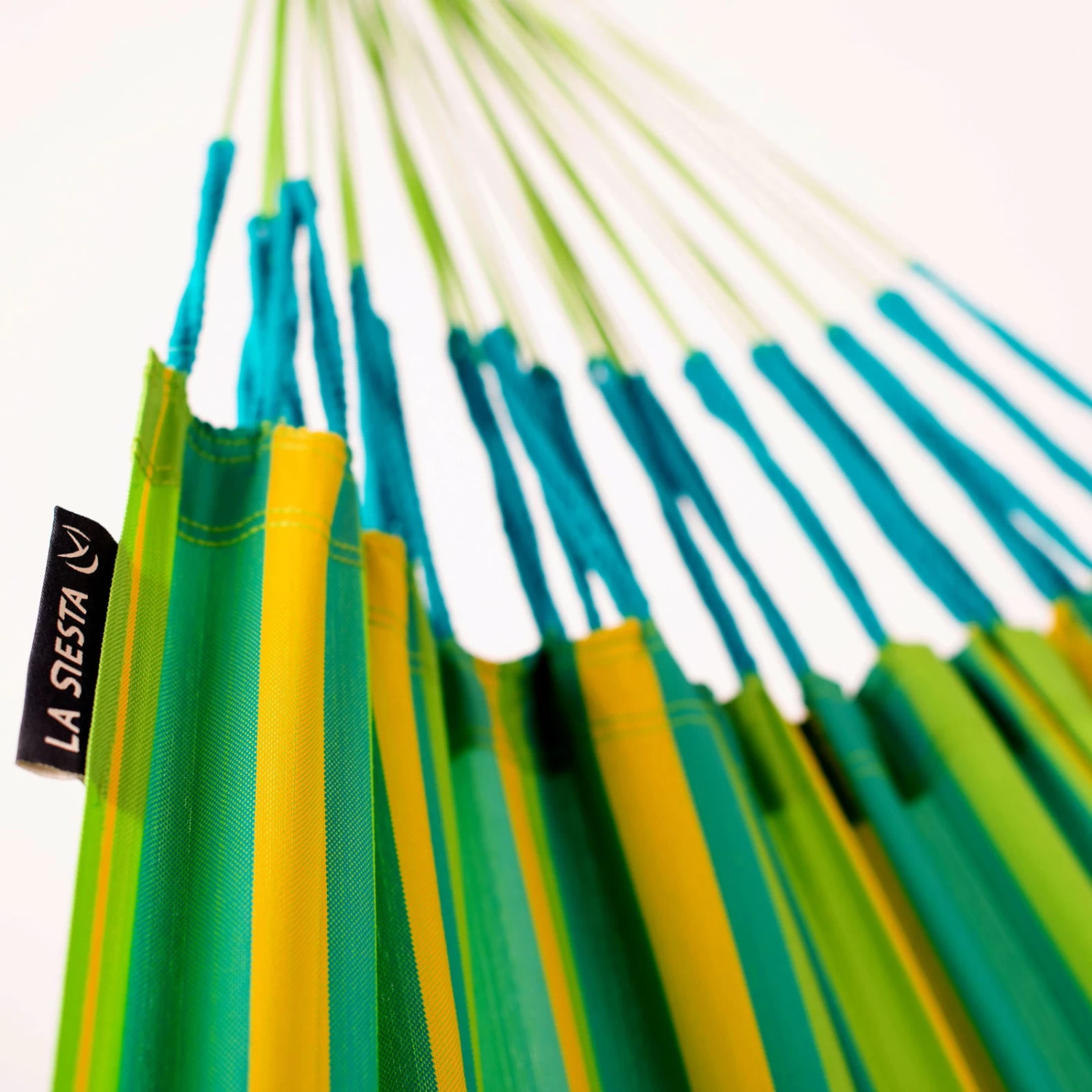 Mit der Doppel-Hängematte Brisa von La Siesta können Sie entspannt Zeit zu zweit verbringen. Als XXL-Single-Hängematte geht Ihre Brisa ebenfalls perfekt durch. Genießen Sie die unbeschwerte Zeit auf die lässige Art. Zusätzlich profitieren Sie vom strapazierfähigen, pflegeleichten und hochbelastbaren Kunststoffgewebe.