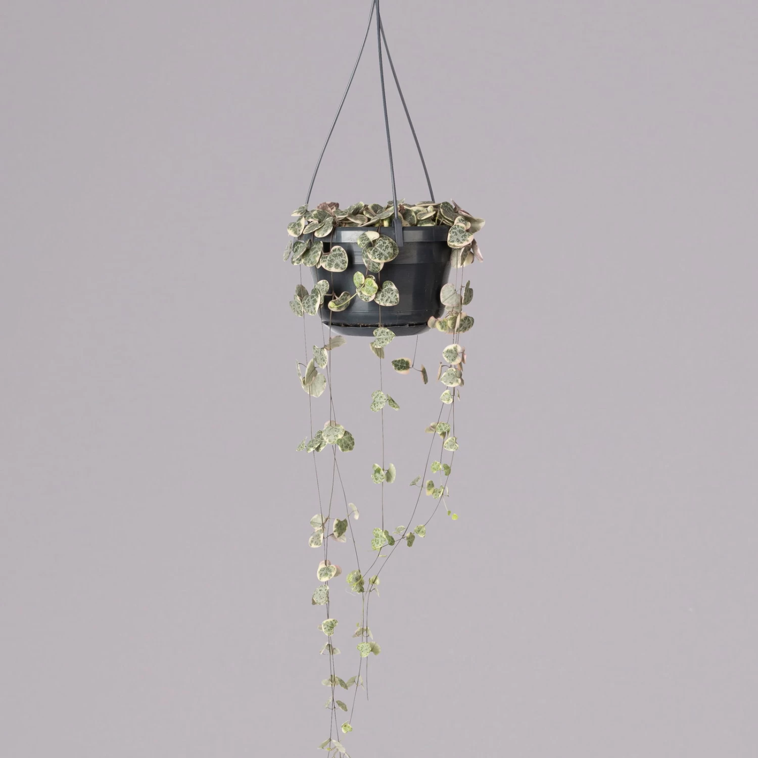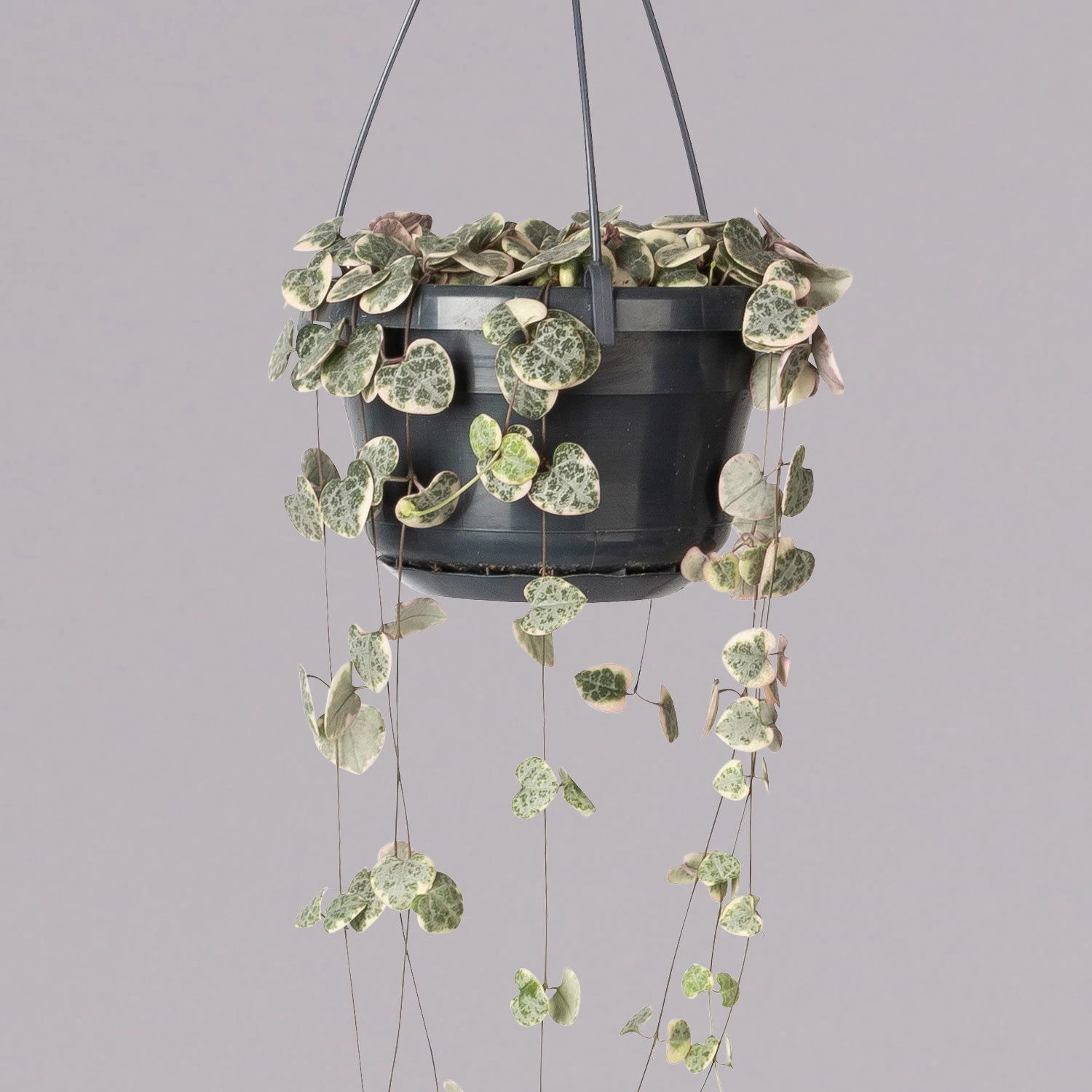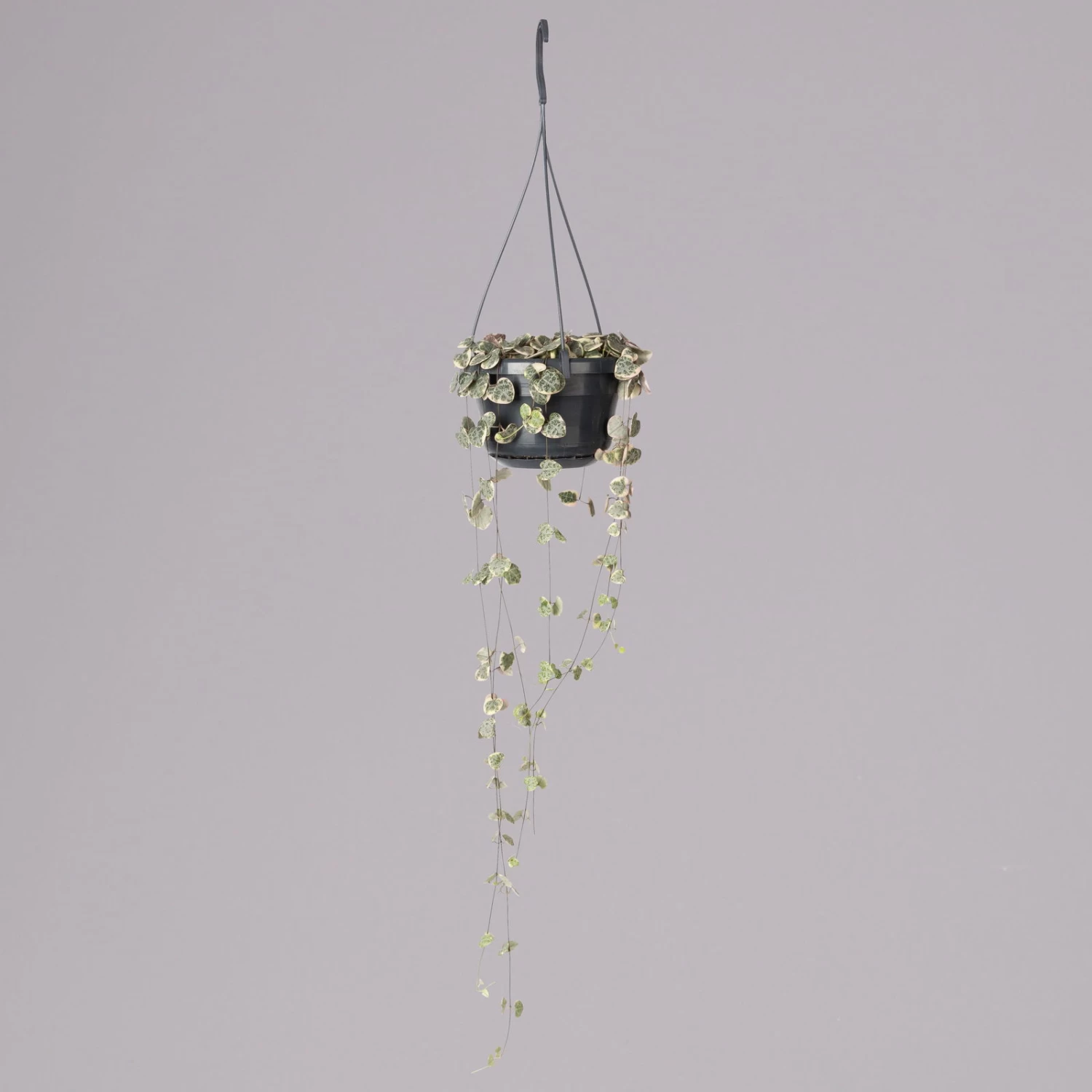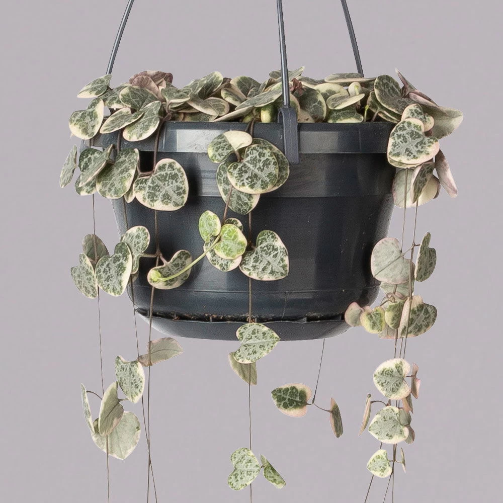 Die Leuchterblume (Ceropegia woodii ‚Variegata‘) ist dank ihrer herzförmigen, panaschierten Blätter und der langen, feinen Triebe eine außergewöhnliche Zimmerpflanze. Noch erstaunlicher sind ihre formschönen Blüten in zartem Rosa, die Sie von Spätsommer bis Herbst erleben dürfen. Die Leuchterblume ist eine sukkulente Zimmerpflanze, die nur moderat zu gießen ist und einen hellen Standort ohne direkte Sonne benötigt.