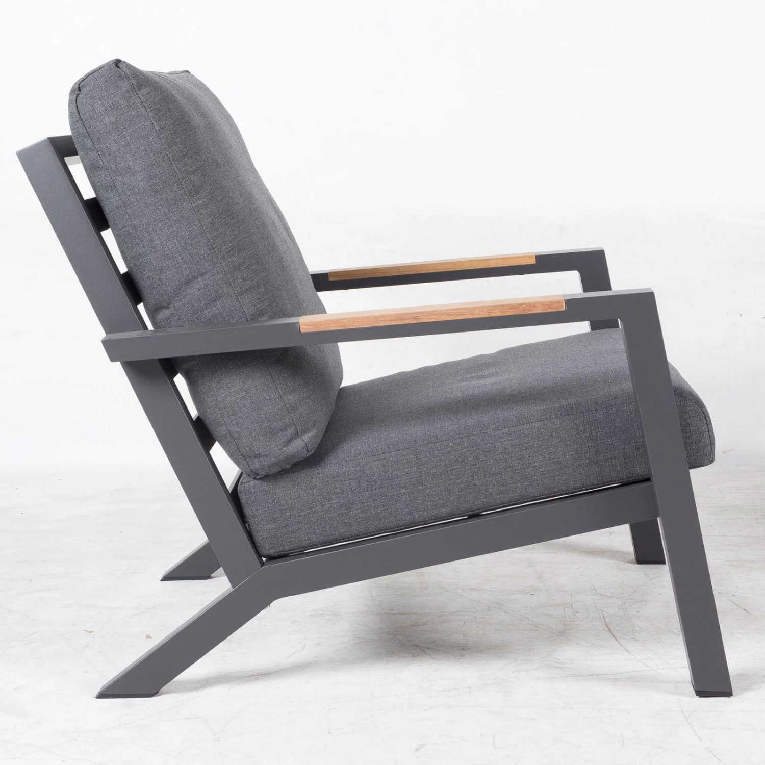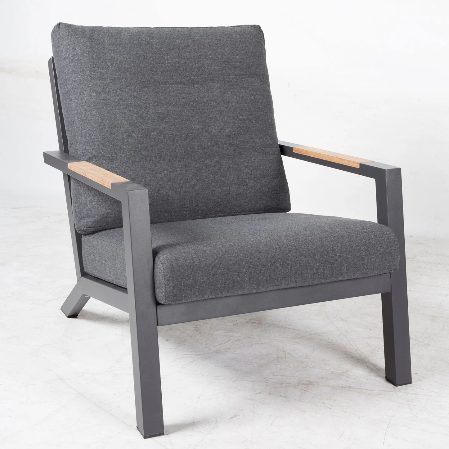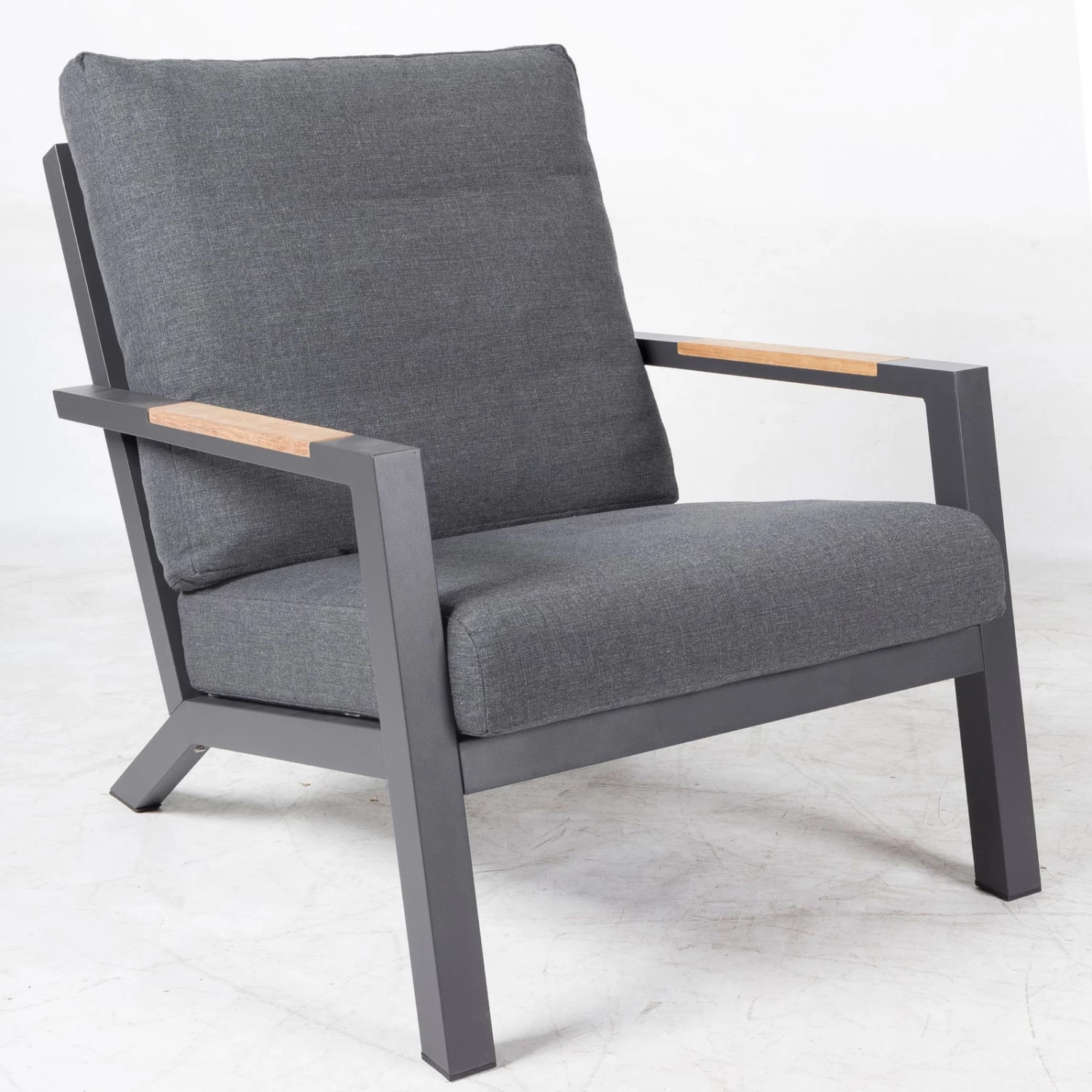 Werten Sie Ihre Sitzlandschaft draußen mit dem Loungesessel ‚Australien‘ unserer Eigenmarke auf. Der komfortable Sessel präsentiert sich in der eleganten Farbe Anthrazit und überzeugt mit hohem Komfortfaktor. Sie erhalten dieses Outdoor-Möbelstück inklusive praktischer Polsterauflagen. Alle Materialen sind für Dauereinsatz im Außenbereich konzipiert und pflegeleicht.
