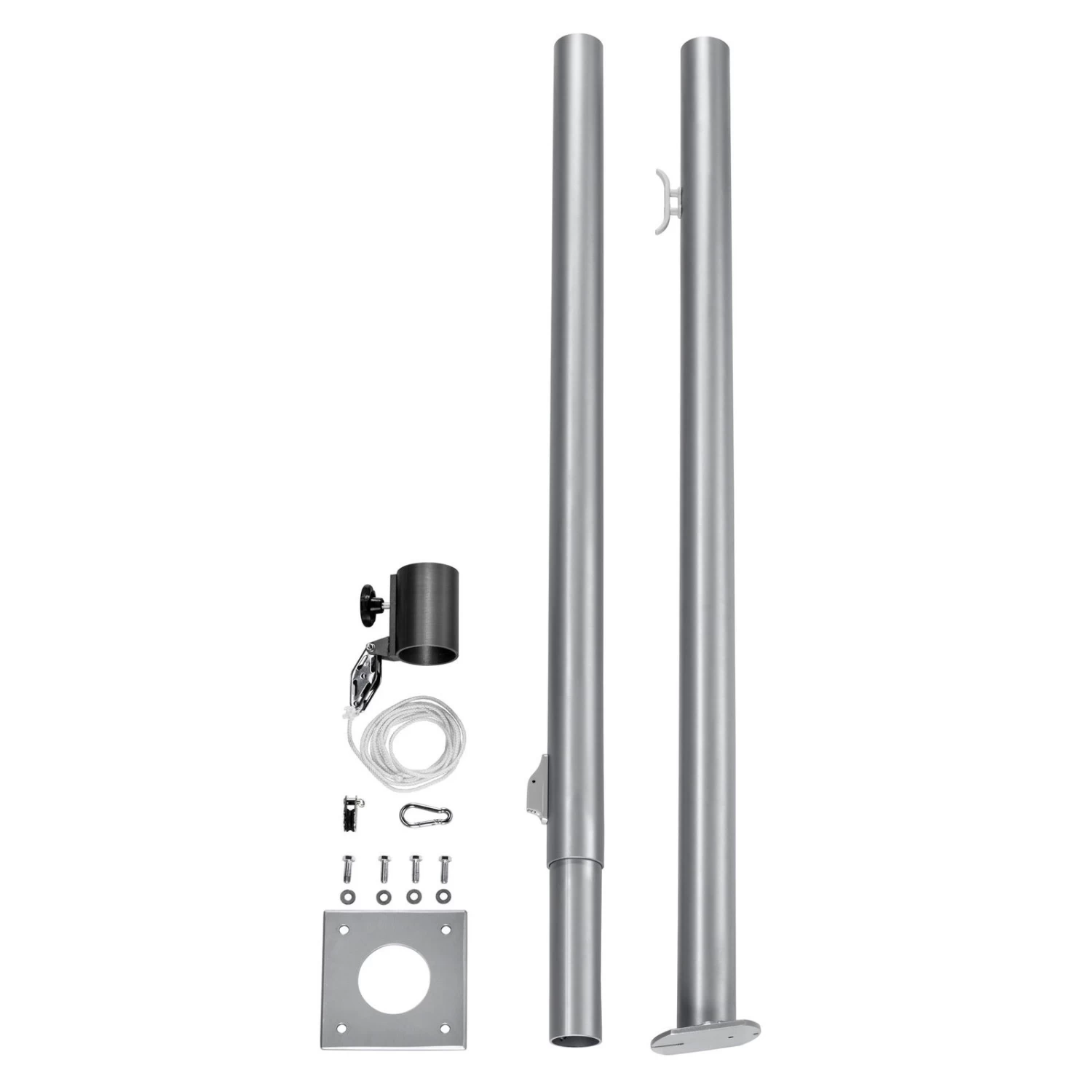 Der Sonnensegel-Mast von Schneider Schirme besteht aus stabilem, feuerverzinktem Stahl und lässt sich in der Bodenplatte um 360 Grad drehen. Je nach Bedarf können Sie den Sonnensegel-Mast zwischen 150 und 240 Zentimetern höhenverstellen. Rund 5 Meter Seil, Karabinerhaken, Seilklemme und Klampe sind im Lieferumfang inklusive.